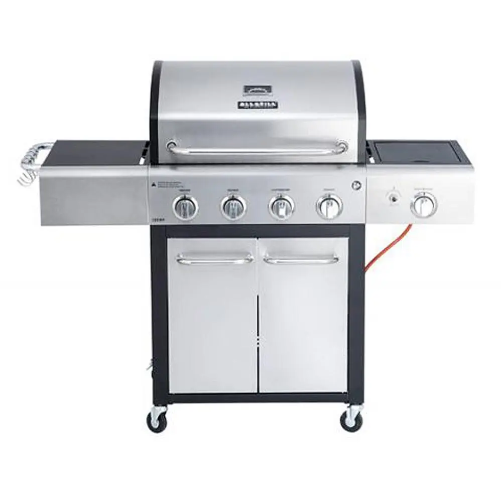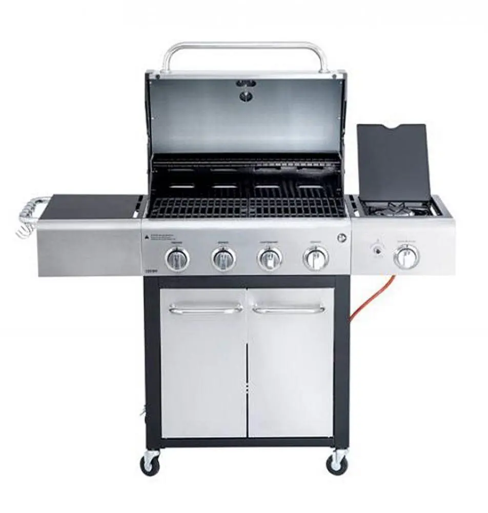 Der Gasgrill verfügt über 4 Flammen, einen Seitenkocher, zwei Grillroste aus Gusseisen und über eine obere Ablage zum Warmhalten. Der Grill wird anschlußfertig mit Gasschlauch und Druckminderer geliefert.