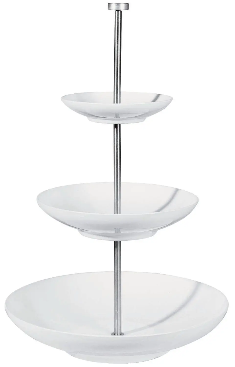 Die dekorative und zeitlose Etagere macht nicht nur optisch etwas her, sondern ist auch ausgesprochen praktisch. Auf drei Etagen lassen sich Aufschnitt und Obst zum Frühstück, Kuchen & Gebäck am Nachmittag oder Antipasti & Co am Abend servieren. Die Etagere hat einen Griff aus Edelstahl (Höhe: 47 cm) und drei verschieden große Teller aus hochwertiger Keramik.