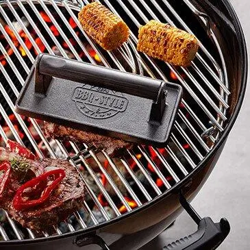 Wer kennt es nicht? Das dicke Steak oder der Burger-Pattie ist außen ganz verbrannt und innen noch blutig, roh. Das passiert mit dem Fleischbeschwerer aus massivem Gusseisen fortan nicht mehr. Einfach auf das Grillgut drücken und perfekt durchgebratenes Fleisch mit formtypischen Rillen erhalten.