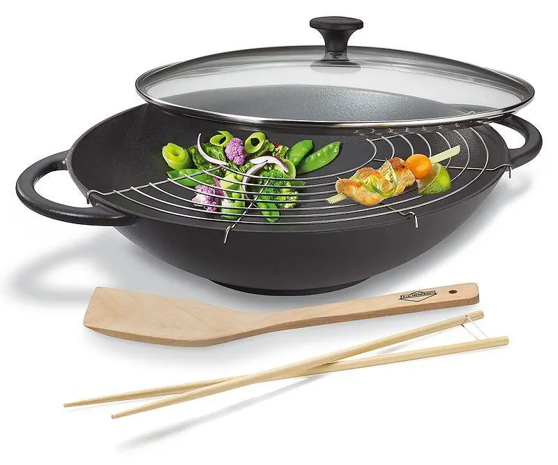 Küchenprofi Wok Set Provence in schwarz aus Gusseisen inkl. Zubehör. Der Wok aus der Serie „Provence“ von Küchenprofi ermöglicht eine optimale Hitzeverteilung, denn das Gusseisen sorgt dafür, dass die Wärme über den Boden und den Rand gleichmässig verteilt und an das Gargut weitergegeben wird.