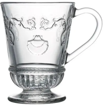 La Rochère Tasse mit Henkel Abeille, 6er-Set. Tassen aus gepresstem Glas, verziert mit Barockdekor, Blumenranken und Jakobsmuscheln.