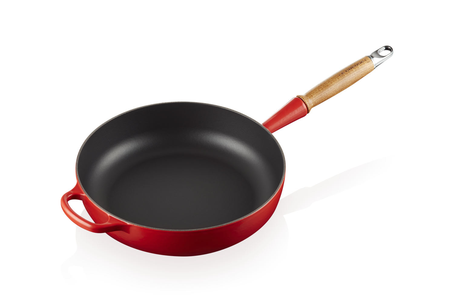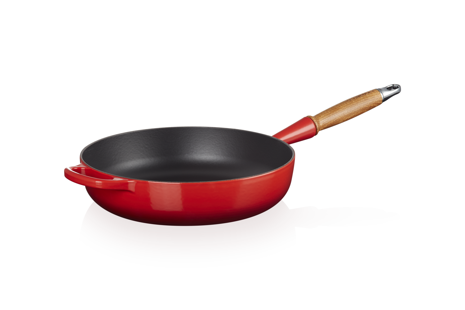 Auch ein großer Gegengriff ermöglicht ein rundum sicheres Kochen – selbst mit Handschuhen. Durch den Holzgriff bleibt die Pfanne mit 28 cm Durchmesser auch in heißem Zustand problemlos anfassbar. Sie ist durch ihre erhöhten Seitenwände perfekt zum Einkochen von Flüssigkeiten geeignet, zudem wird der Herd vor Spritzern geschützt. Die Sautépfanne von Le Creuset ist unentbehrlich für das Rösten (Garschwenken) von fein geschnittenen Fleischstücken in der Pfanne.