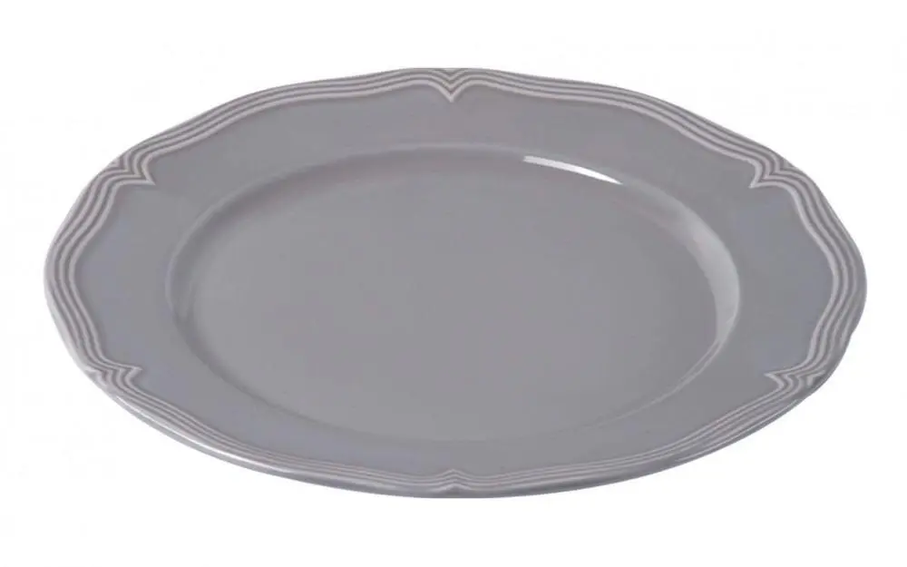 Pillivuyt Teller flach Eclectique Louis XIV in nebelgrau. Die Serie Eclectique wurde im 19. Jahrhundert entwickelt und präsentiert sich in weiß und eleganten Grautönen, die in Kombination miteinander besonders gut zur Geltung kommen.