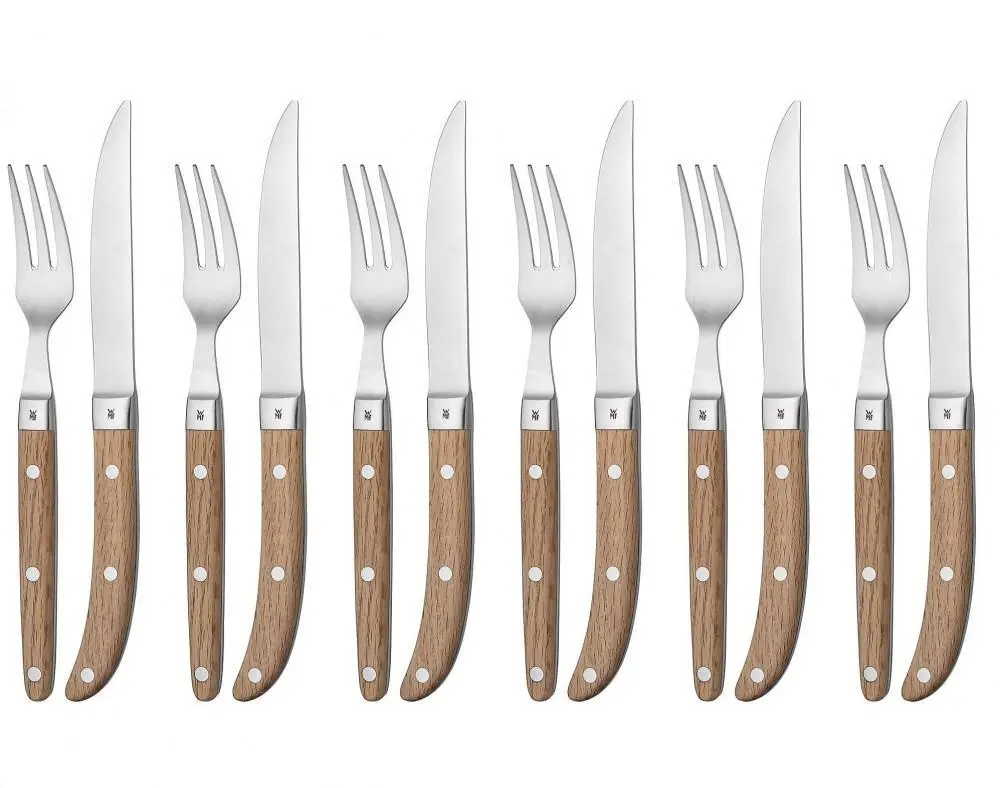 WMF Steakbesteck Set Ranch, 12-teilig Hochwertiges geschmiedetes Steakbesteck mit Echtholz geölt und genietet – Ranch! Bestehend aus sechs Steakmesser und 6 Steakgabeln.